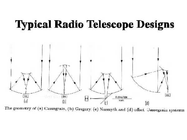 Radio telescopes function in much the same way as optical telescopes. A parabolic reflector collects energy from a large area, determined by the reflector's radius. This energey is brought to focus on a detector. Comon focuses for radio telescopes included cassigrain, prime and offset. Unlike optical astronomy, the longer wavelengths of radio frequencies are not suited to direct imaging detectors. Usually a point detector is employed. With a single reflector, this requires many transit passes, or scanning to build up an image.