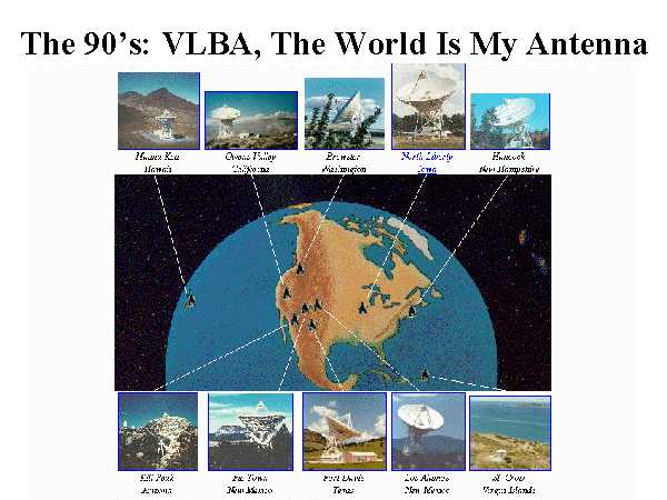 Not satisfied with the VLA, radio astronomers have designed a clever method for combining data from widely separated radio telescopes. The key to very long baseline interferometry is to be able to correllate the exact instant of each observation. The availability of cesium atomic clock standards to radio telescopes now allows the antennas spread across the Earth to act as a single telecope 8000 miles in diamter. |