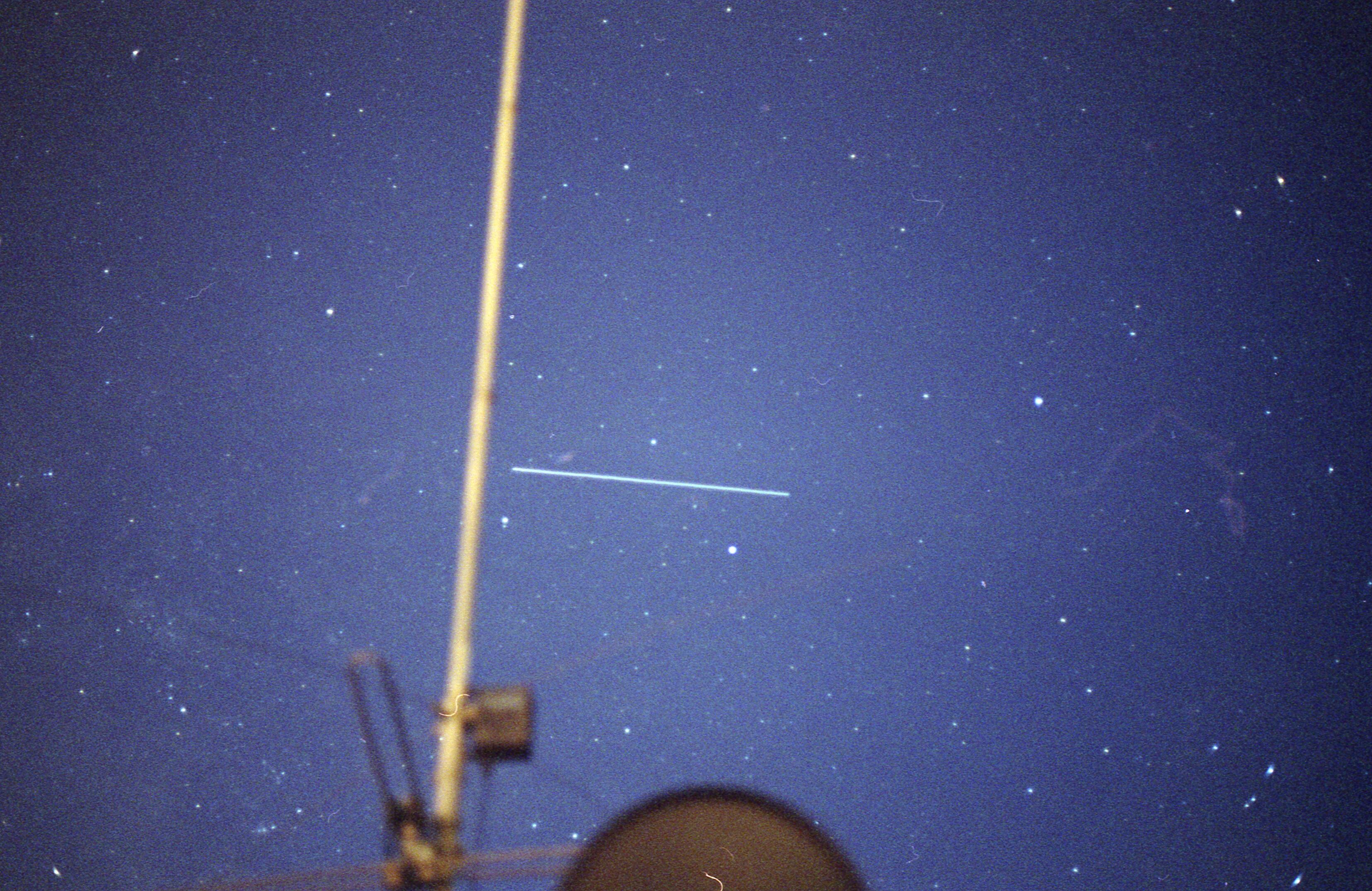 Satellite Time Lapse 2/20/2006 Similarly, wide field CCD images have proved the feasibility of their use. The image in Figure above was a 2 second exposure from a time lapse series that was produced during Mar's recent occultation of SAO76327. This 2 second exposure, and those bounding it, show the passage of a high inclination angle satellite through the frame. Analysis of the image show a plate scale of 42.414"/pixel and a FWHM of 3.6, yielding a PSF of 2.55'. This would indicate that short exposure, wide field CCD images should be able to provide about twice the positional accuracy of photography with comparable time resolution. With computer triggering of exposures and precision timing, even better results should be obtainable. Furthermore, flatter fields should also lead to better astrometry from all digital images. Conslusion These results have convinced me that the photographic methods are viable within the error ranges projected. These methods will reach the broadest audience of potential participants. The growing affordablity of capable digital cameras should make these methods even easier to achive. I am now in the process of taking further imagery and modifying SSC orbital prediction software to solve for satellite acceleration and orbits and to compute meteor entry trajectories.