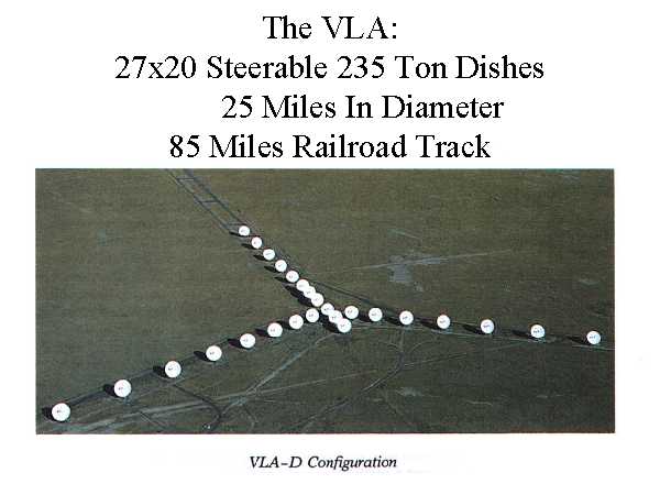 The VLA was contructed in the shape of a Y over 25 miles in diameter. The antennas could be moved along the axis of the Y to trade off resolution and sensitivity. Each antenna was identical so the mass production techniques could be used to manufacture the dishes, receivers, amplifiers, transmission lines and processing equiement. |